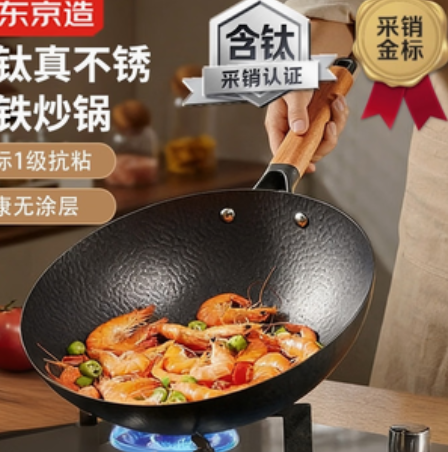 100210572440-200 京东京造炒锅 炒菜燃气灶电磁炉可用爆炒无涂层防粘 锤纹钛铁炒锅 30cm