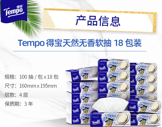 3761608-90得宝(TEMPO)一博同款 抽纸 M码 无香4层100抽*18包 新旧包装混发 纸巾卫生纸